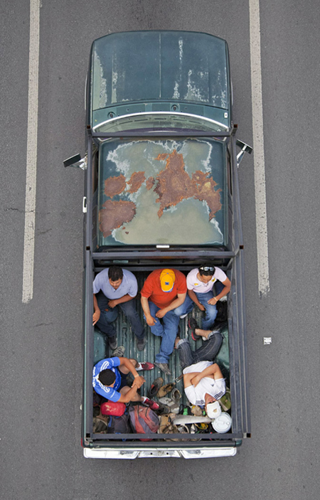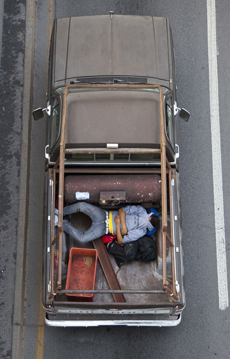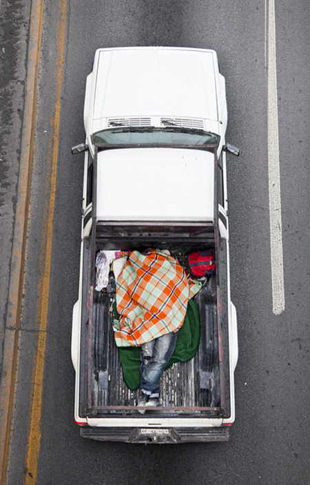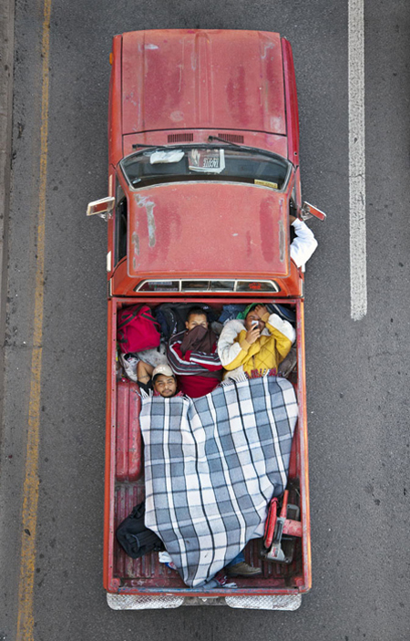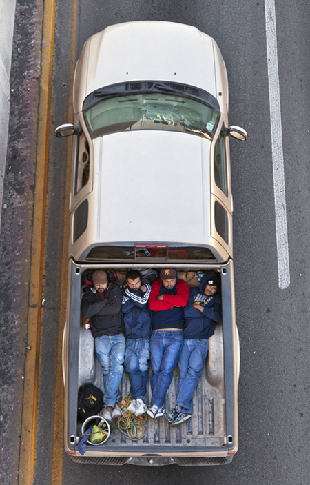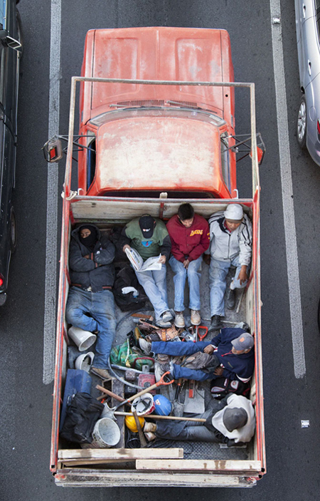 Nacido en 1977 en La Romana (República Dominicana) y residente en Monterrey (Mexico), Alejandro Cartagena es un fotógrafo que estudió Artes Visuales en la Universidad Autónoma de Nuevo León (Monterrey, Mexico). Su trabajo, está centrado en examinar las cuestiones sociales, urbanas y medioambientales. Entre sus proyectos se encuentra la serie «Car Poolers» (coches compartidos) a la que pertenecen las imágenes de este post y con la que refleja una práctica común: compartir coche para ir al trabajo. La curiosidad la marca el punto privilegiado donde se situó el fotógrafo para captar dicha práctica. Podéis ver más fotografías de Alejandro Cartagena en su web personal.