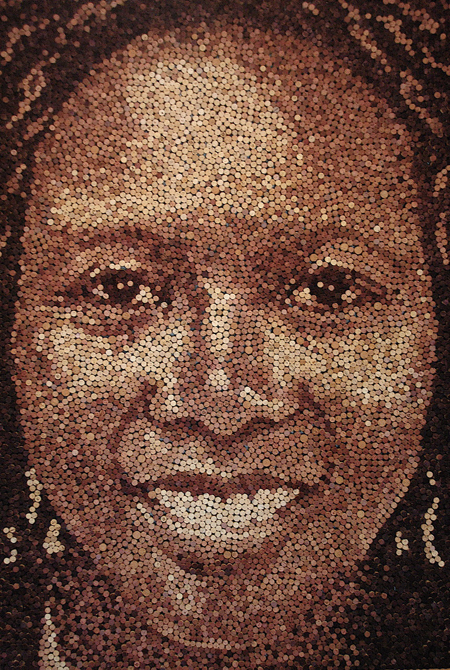 El artista y el profesor de arte Scott Gundersen es el creador de estos retratos realizados mediante corchos de botellas de vino. Una vez recoge los corchos que le dan la familia, amigos y negocios locales, dibuja el retrato en la madera, y coloca los corchos atendiendo a sus tonalidades. Para completar el retrato de Grace, a la que pertenecen las dos primeras imágenes del post y los vídeos, utilizó 9.217 corchos y 200 horas. Podéis ver más información sobre Scott Gundersen en su web.